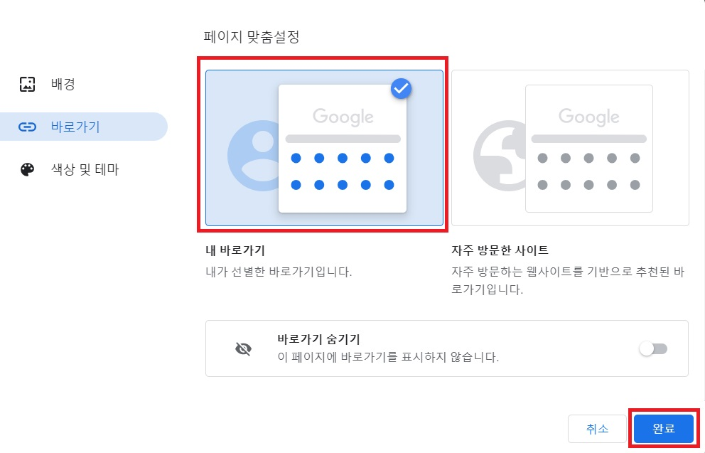 3. 내 바로가기를 선택한 후 완료를 눌러줍니다.