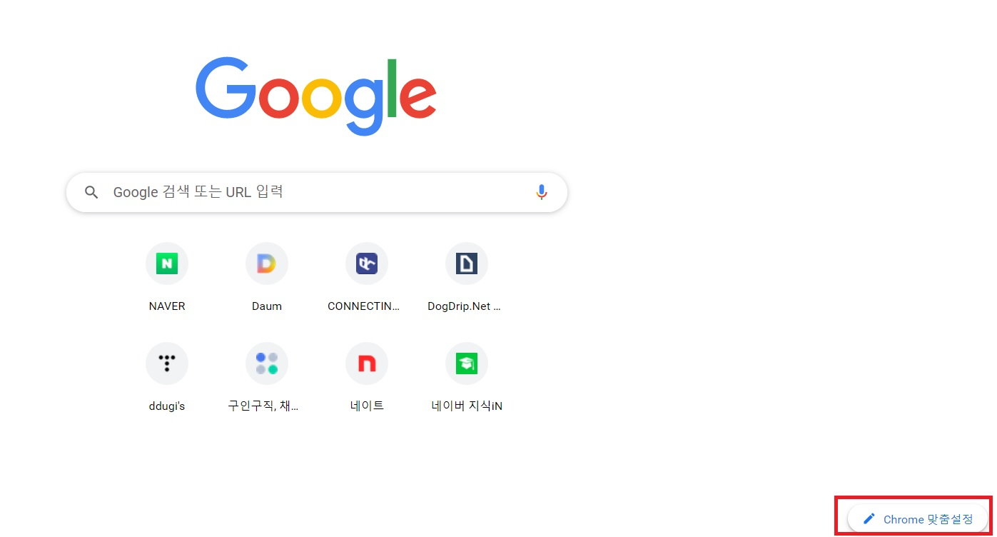 1. 구글 크롬 메인 페이지 우측 하단에 Chrome 맞춤설정 클릭합니다.