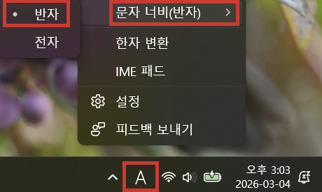 - 윈도우 작업 표시줄 오른쪽 아래 한/영 전환 아이콘 ( '가' 또는 'A')을 우클릭하여 '전각/반각' 설정을 반각으로 선택