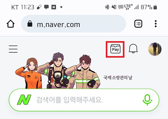 1. http://m.naver.com 으로 접속해준뒤, 우측 상단에 Pay 버튼을 눌러줍니다.