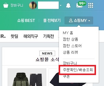 2. 우측 상단에 쇼핑 MY를 눌러주시고, 주문확인/배송조회를 눌러줍니다.