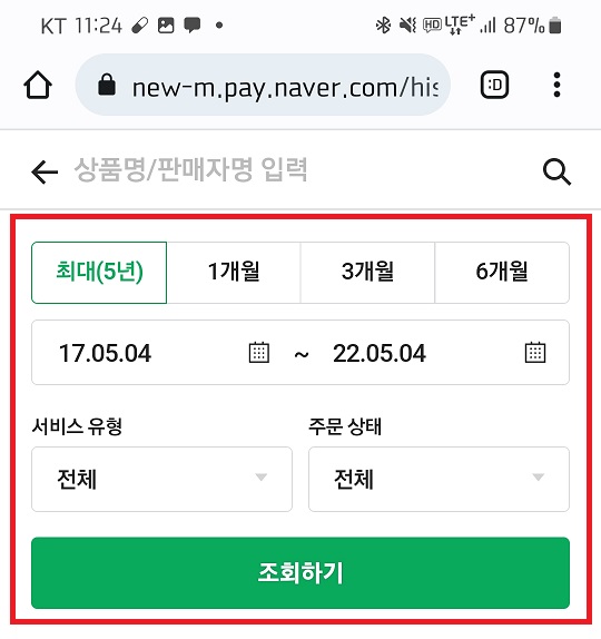 4. 아래와 같이 화면이 나오면 날짜를 지정해 조회하시면 됩니다. (5년 내 내역 조회 가능)