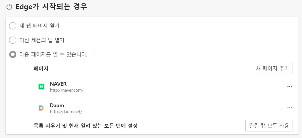5. 엣지를 실행할 때마다, 설정한 사이트가 자동으로 시작됩니다.