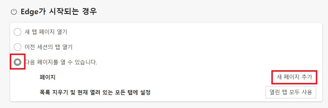 2. 설정화면에서 다음 페이지를 열 수 있습니다 체크 해주시고, 새 페이지를 추가해줍니다.